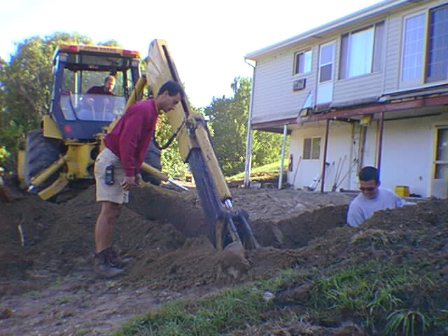 Demolition of the old building is completed. Footings for the new building are underway. Employees Dave Hensel & Erick Hall work along side of a Belill Excavating, Inc. employee on the Back Hoe.