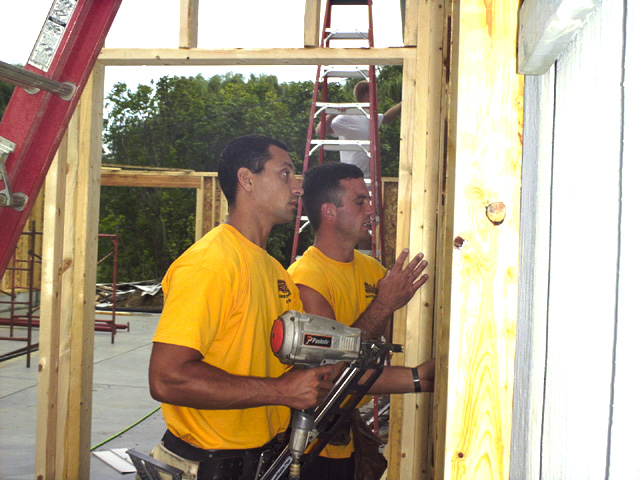 Rinks employees, Dave Hensel (left) and Erick Hall level a wall before fastening it. The Rinks Construction, Inc. team takes great pride in doing quality work.